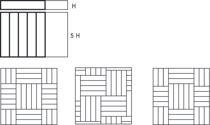 4.12. Укладка «Блоки» Клеевую кварц-виниловую плитку возможно также укладывать блоками. В этом случае важно помнить о кратности размера плашек, плашка B длину равна 5-ти плашкам в ширину. С учетом этого можно создавать различные блоки и их сочетания.